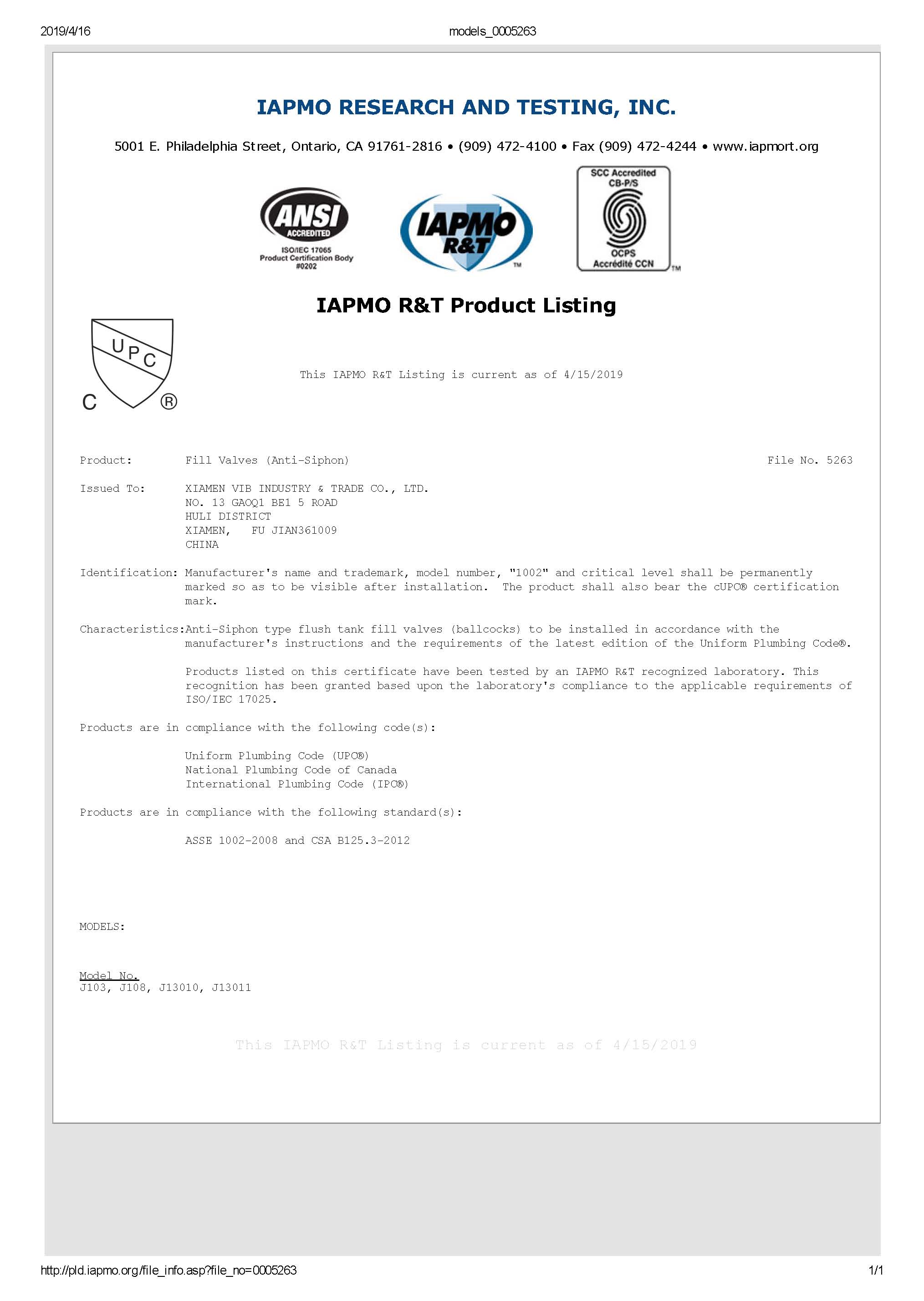 cupc認證-5263 fill valve