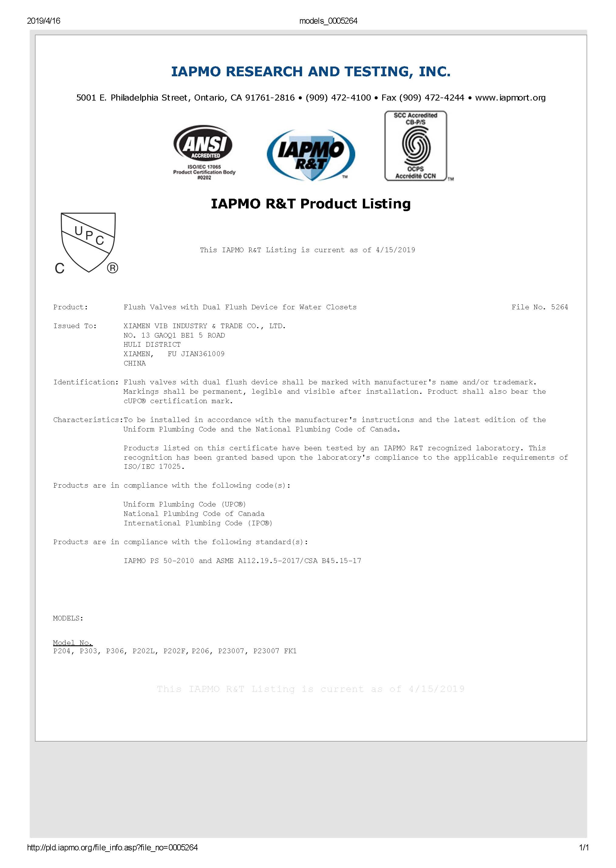 CUPC 5264 dual flush valve