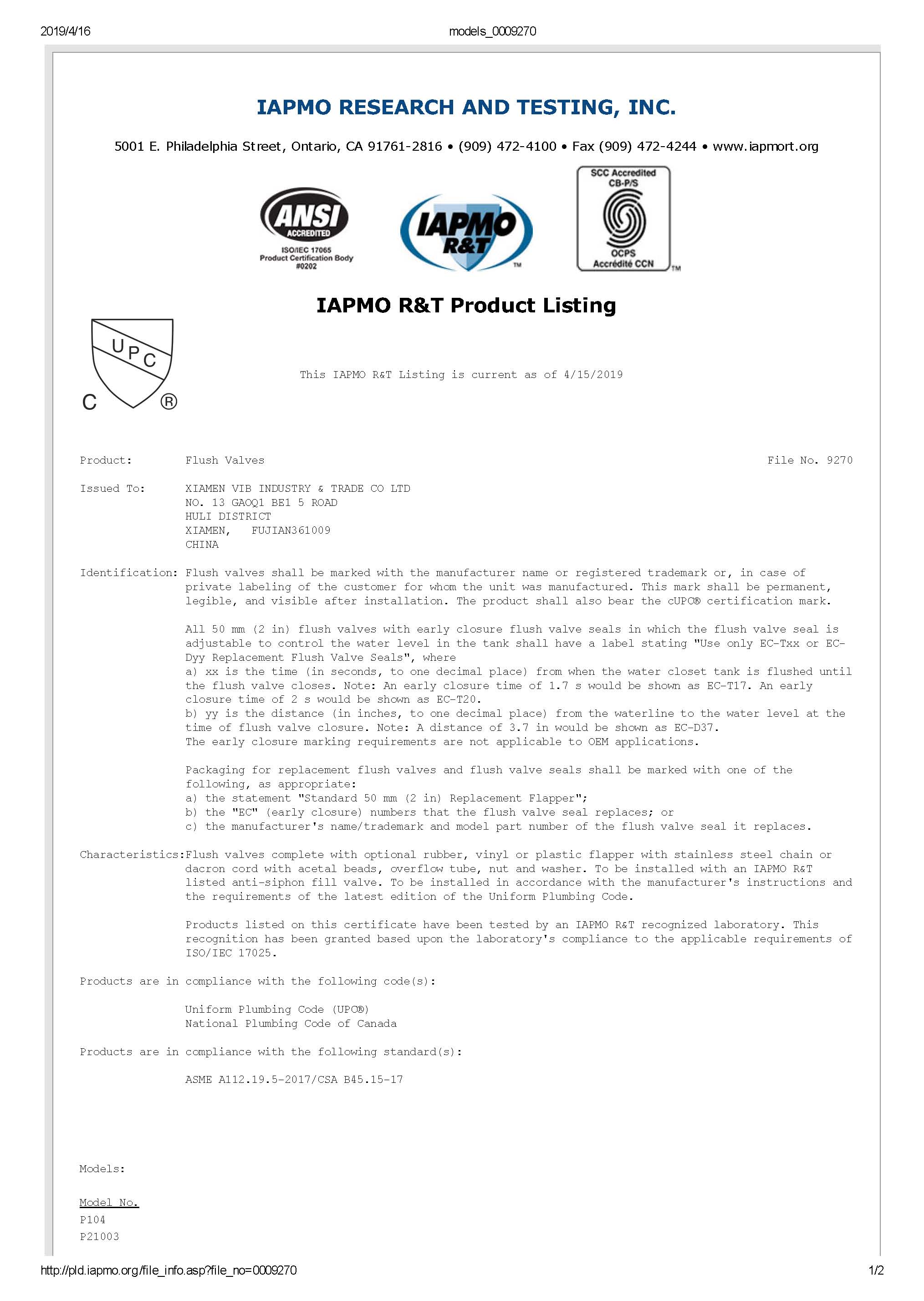 CUPC flapper flush valve